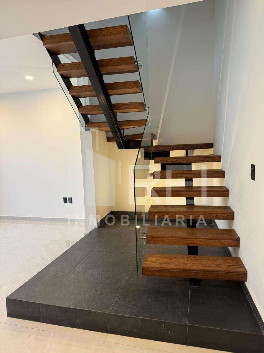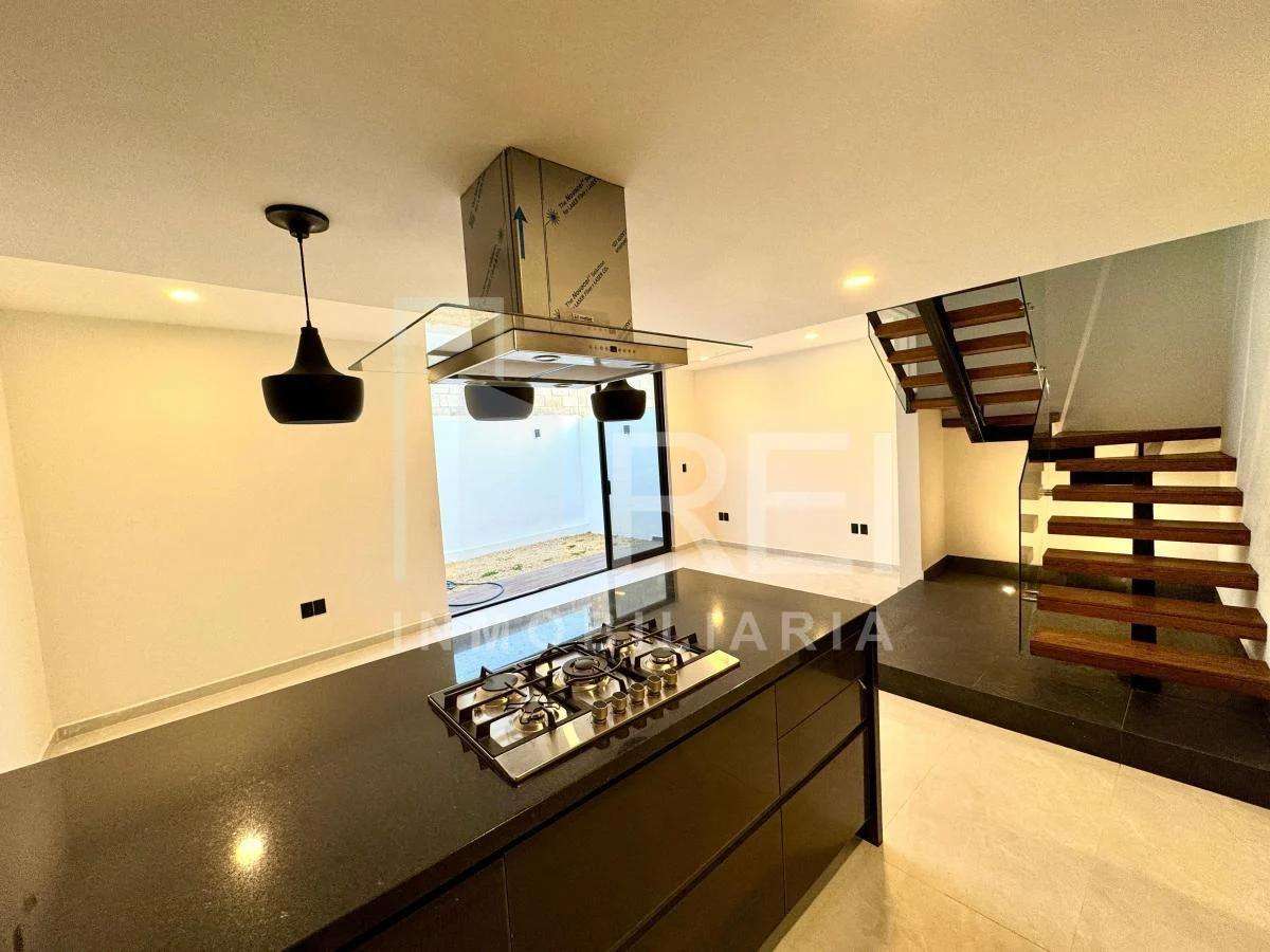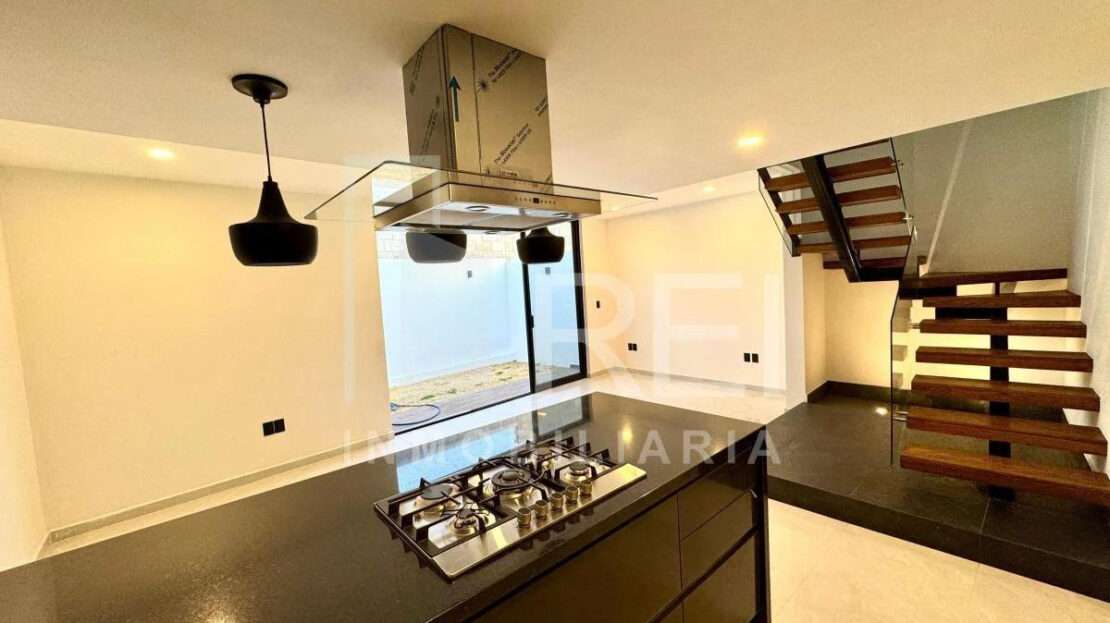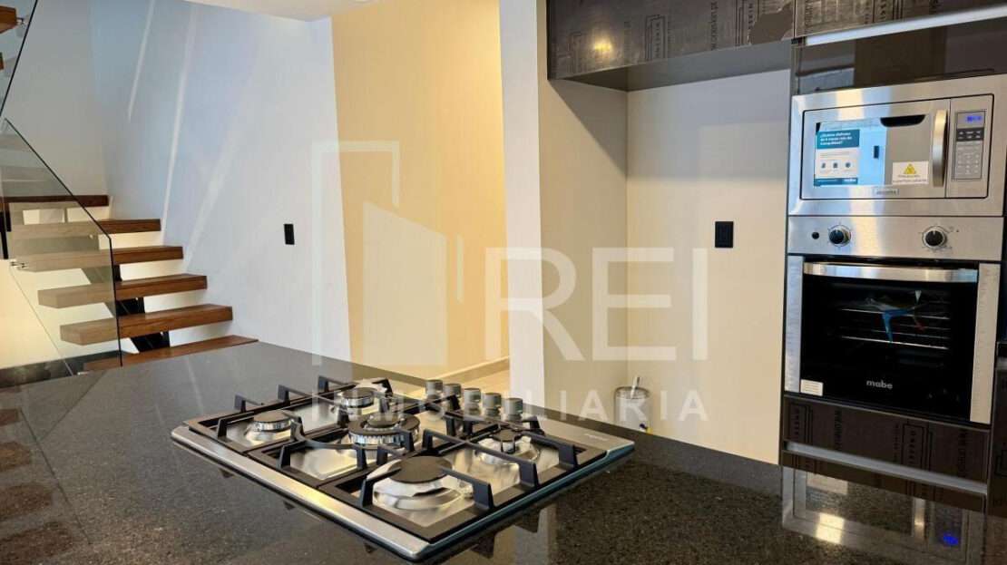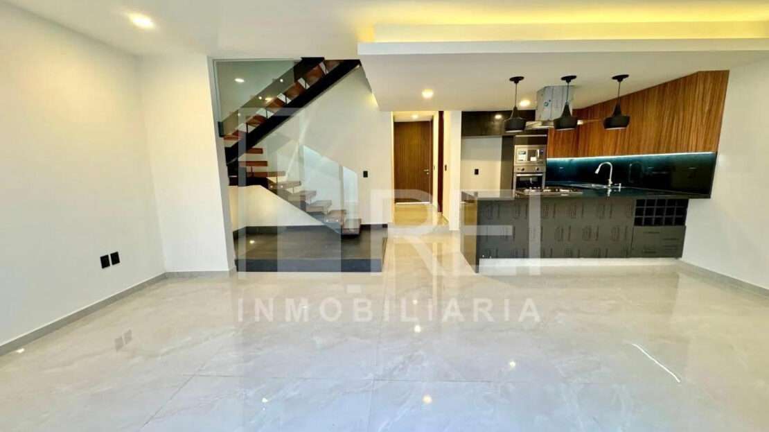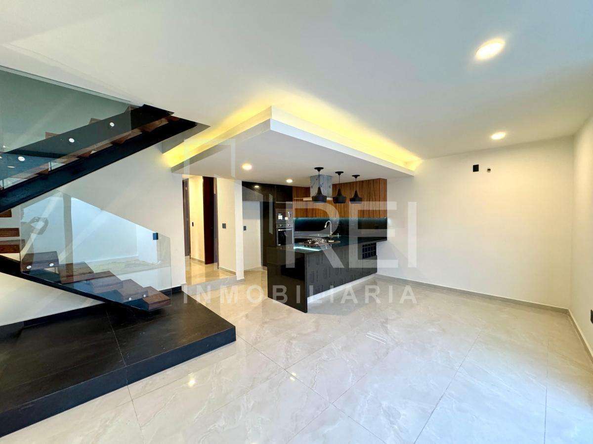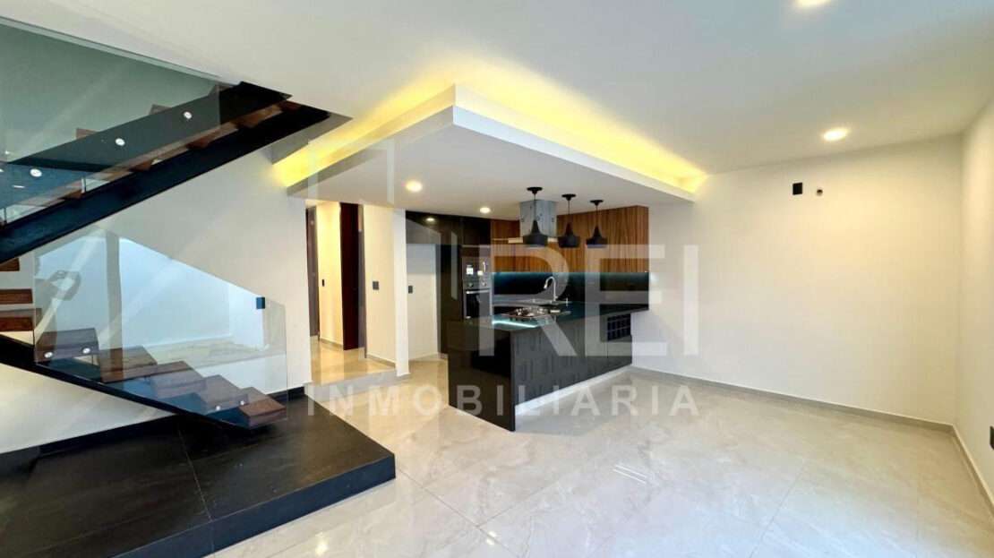 Planta baja: cocina integral con barra de granito e iluminación decorativa, amplia alacena, sala comedor con ventanal corredizo, área de lavado techada, baño completo, recamara con closet o estudio y estacionamiento para dos autos.