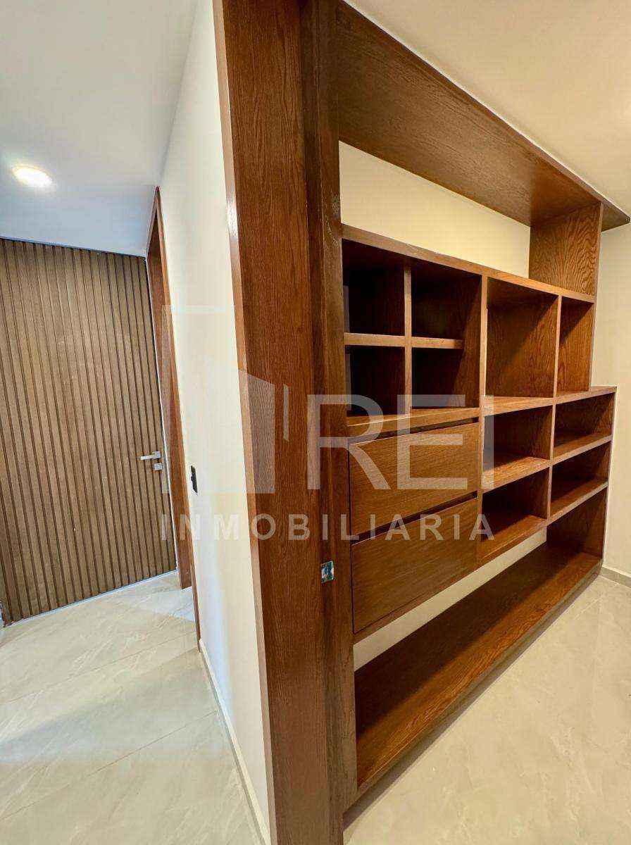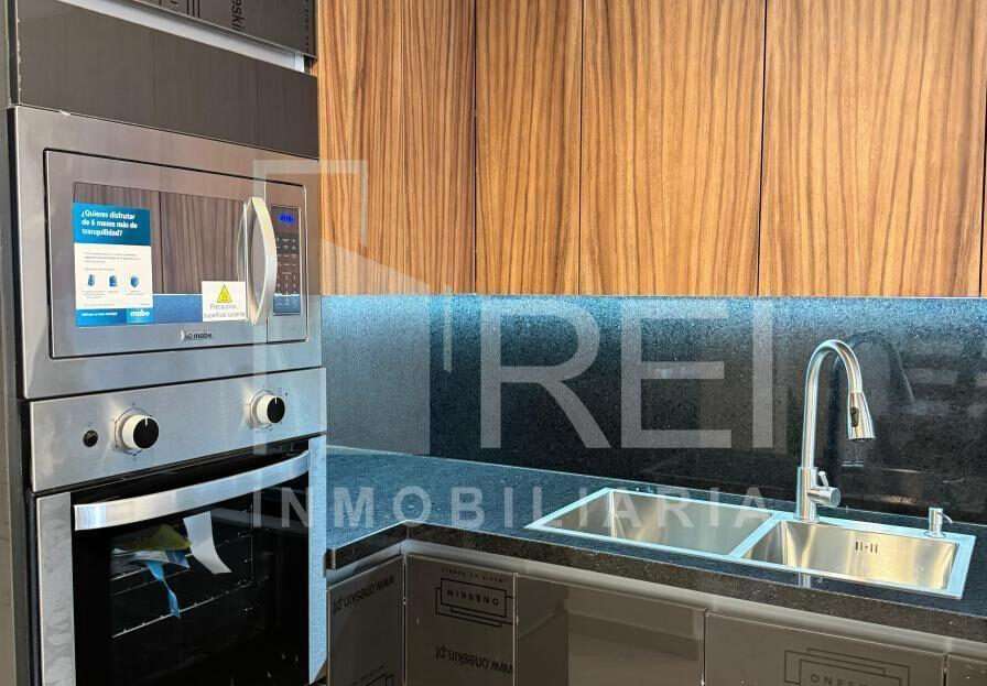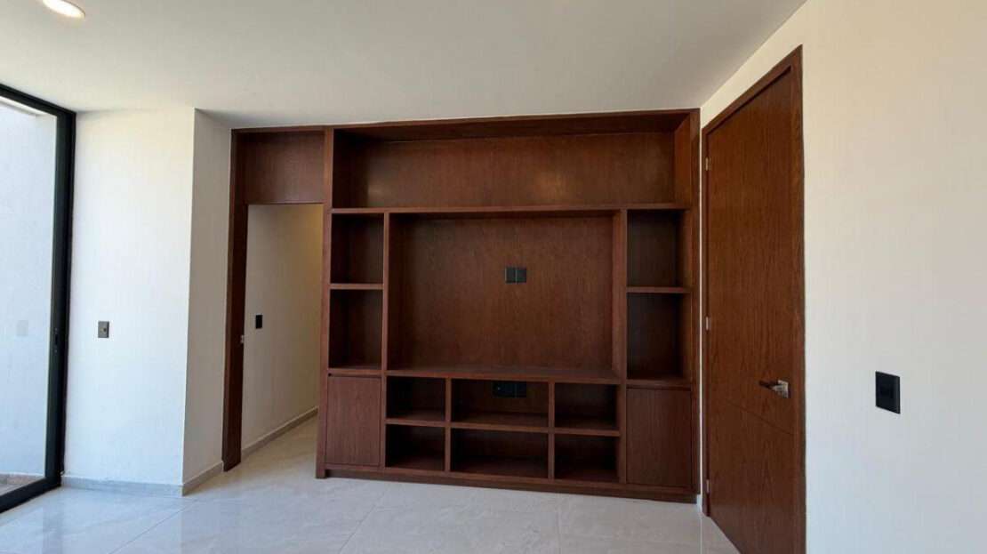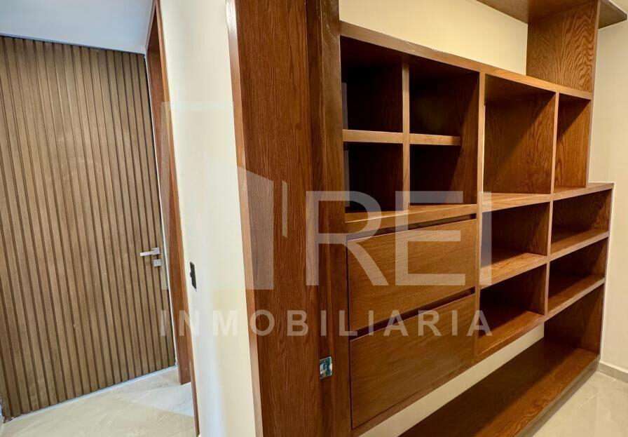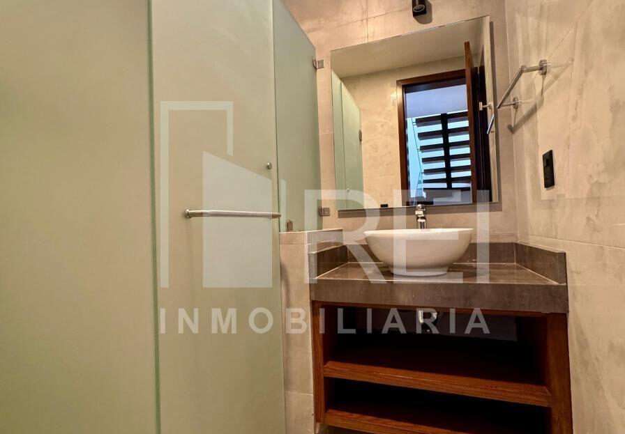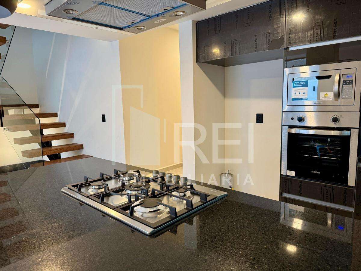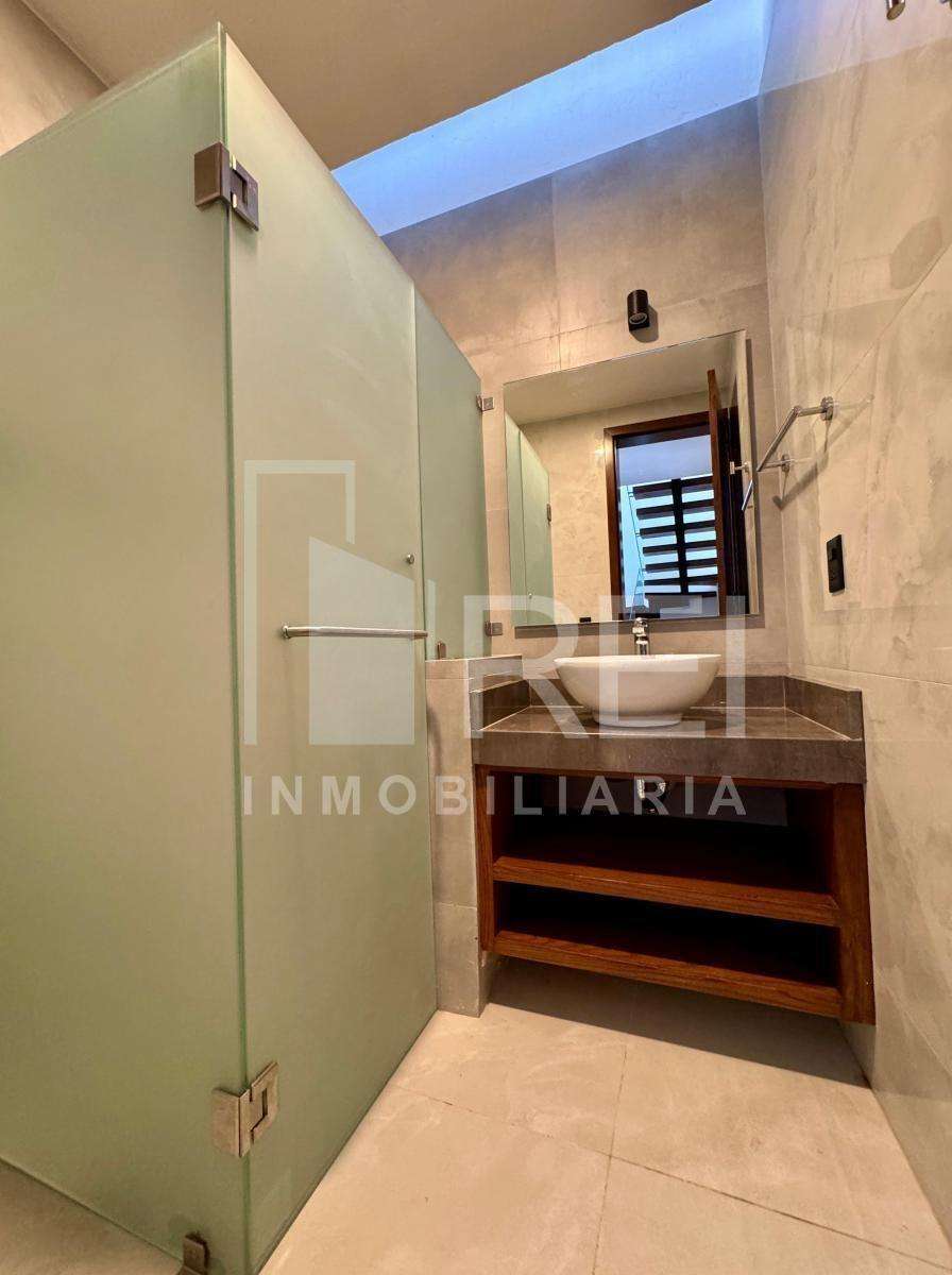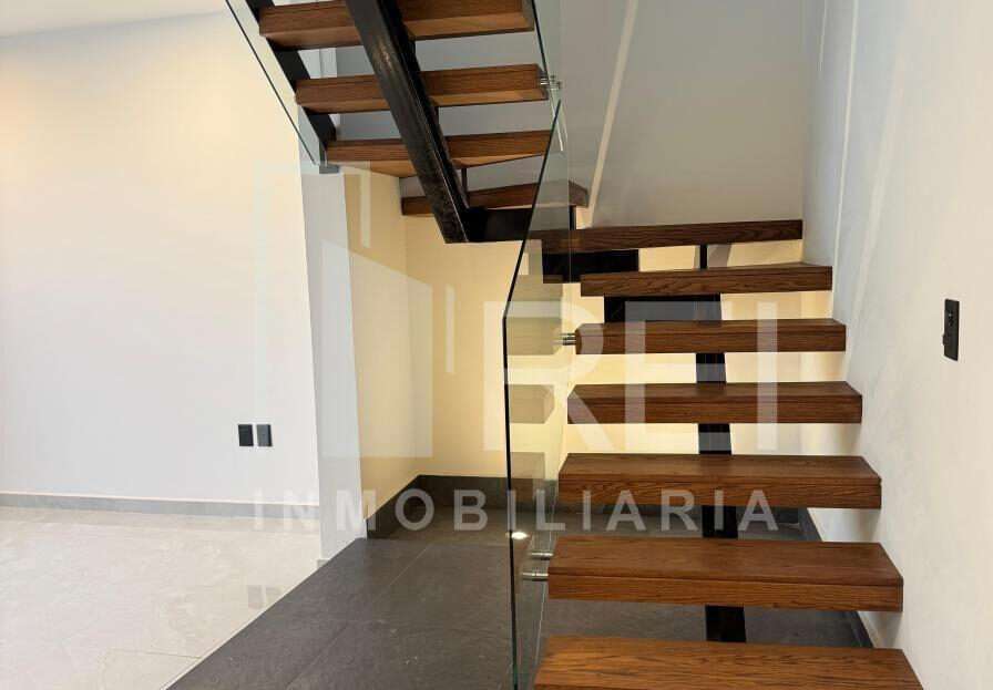 Planta baja: cocina integral con barra de granito e iluminación decorativa, amplia alacena, sala comedor con ventanal corredizo, área de lavado techada, baño completo, recamara con closet o estudio y estacionamiento para dos autos.