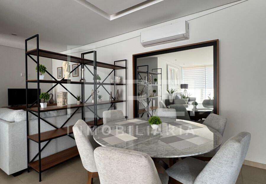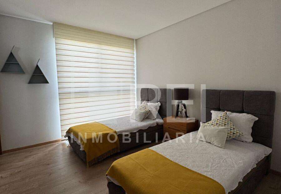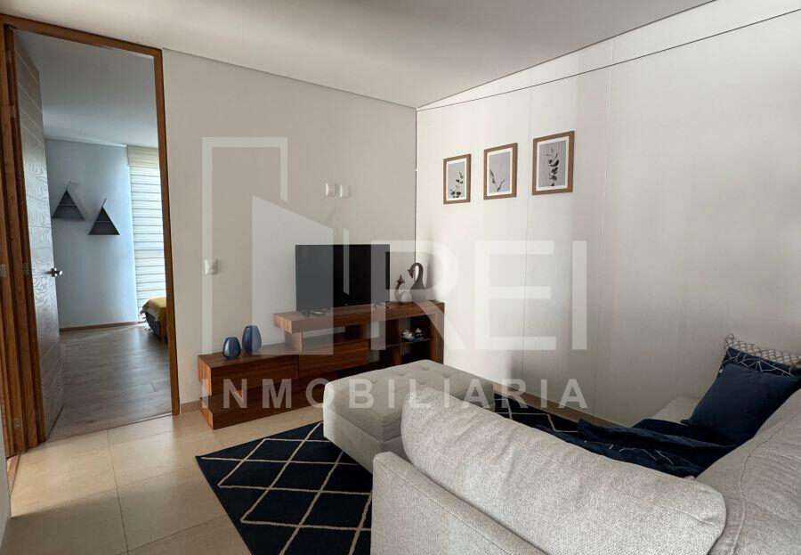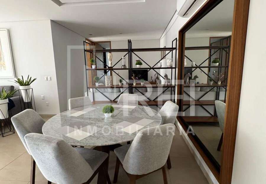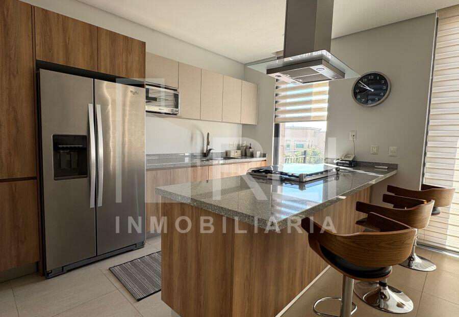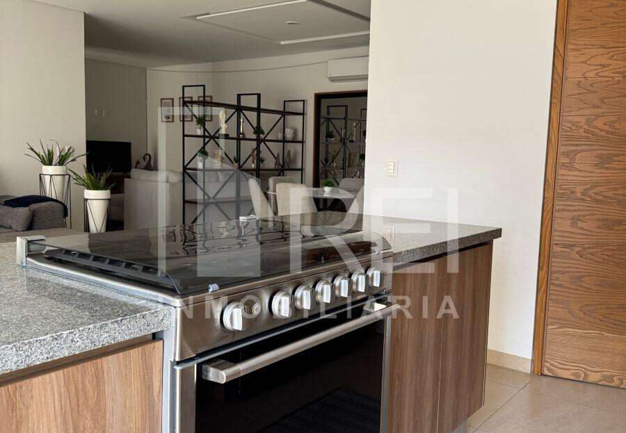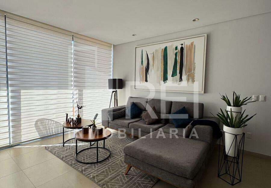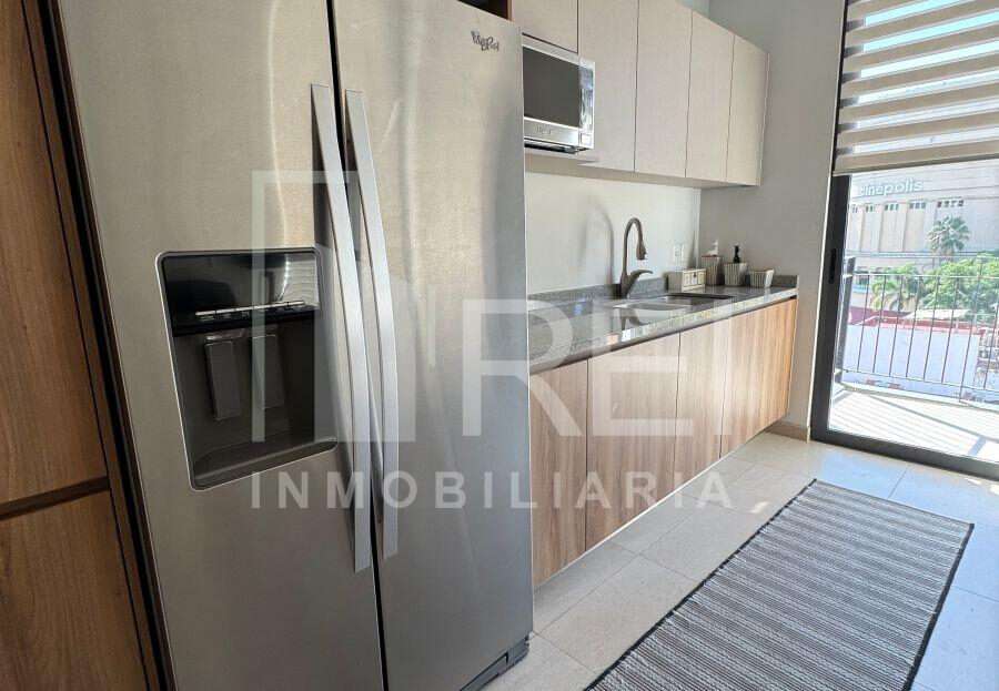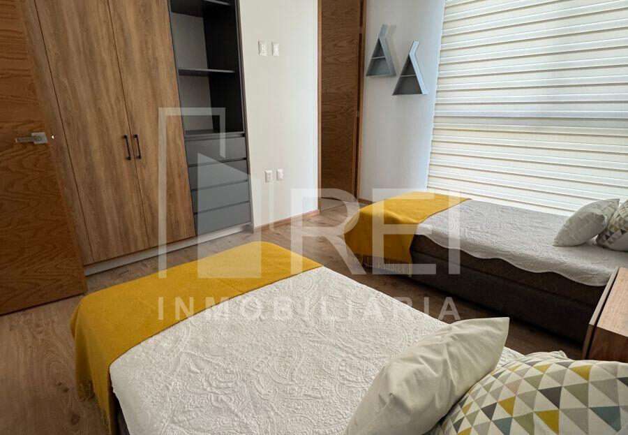 Con dos recámaras cada una con baño integrado en la recámara, estar de TV , sala , comedor, medio baño, cocina integral, refrigerador, microondas, cuarto amplio de lavado con lavadora y secadora, dos cajones de estacionamiento techado, y de amenidades tiene un área común en la terraza , barra, baño de mujer y de hombre. Tiene Aire Acondicionado en las recámaras y en el área común.