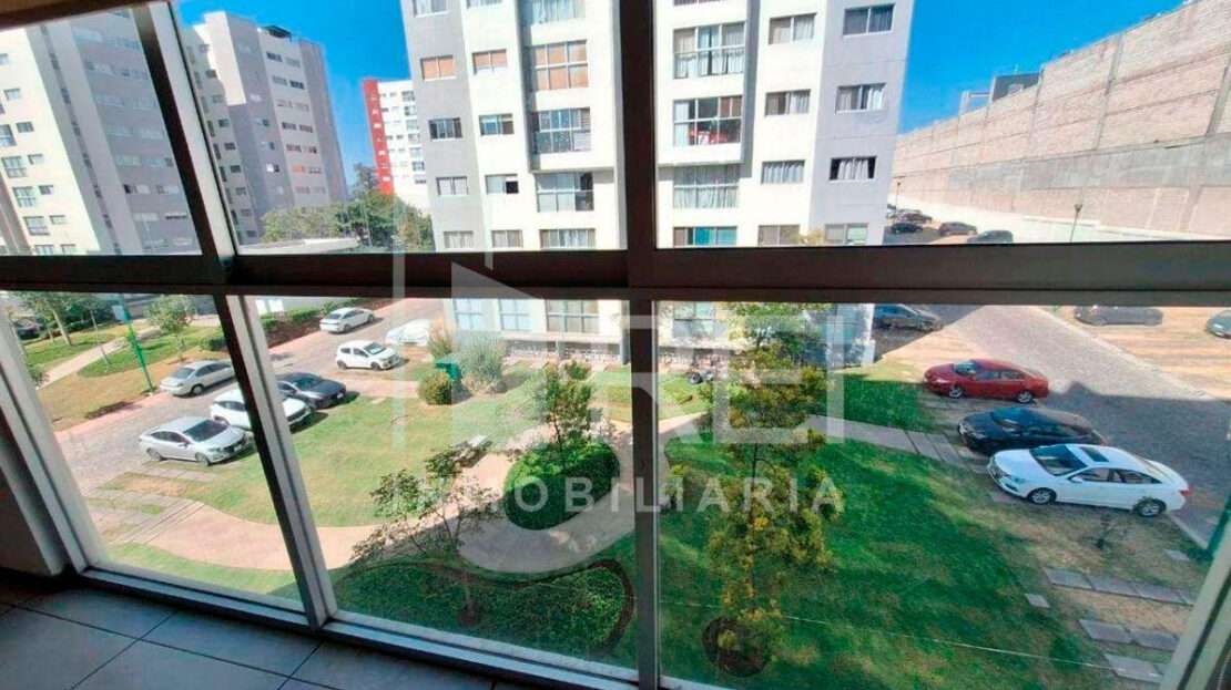 La sala/comedor tiene bonita vista a área verde , acceso controlado, seguridad privada, alberca, terraza, juegos infantiles cerca de la plaza centro sur.