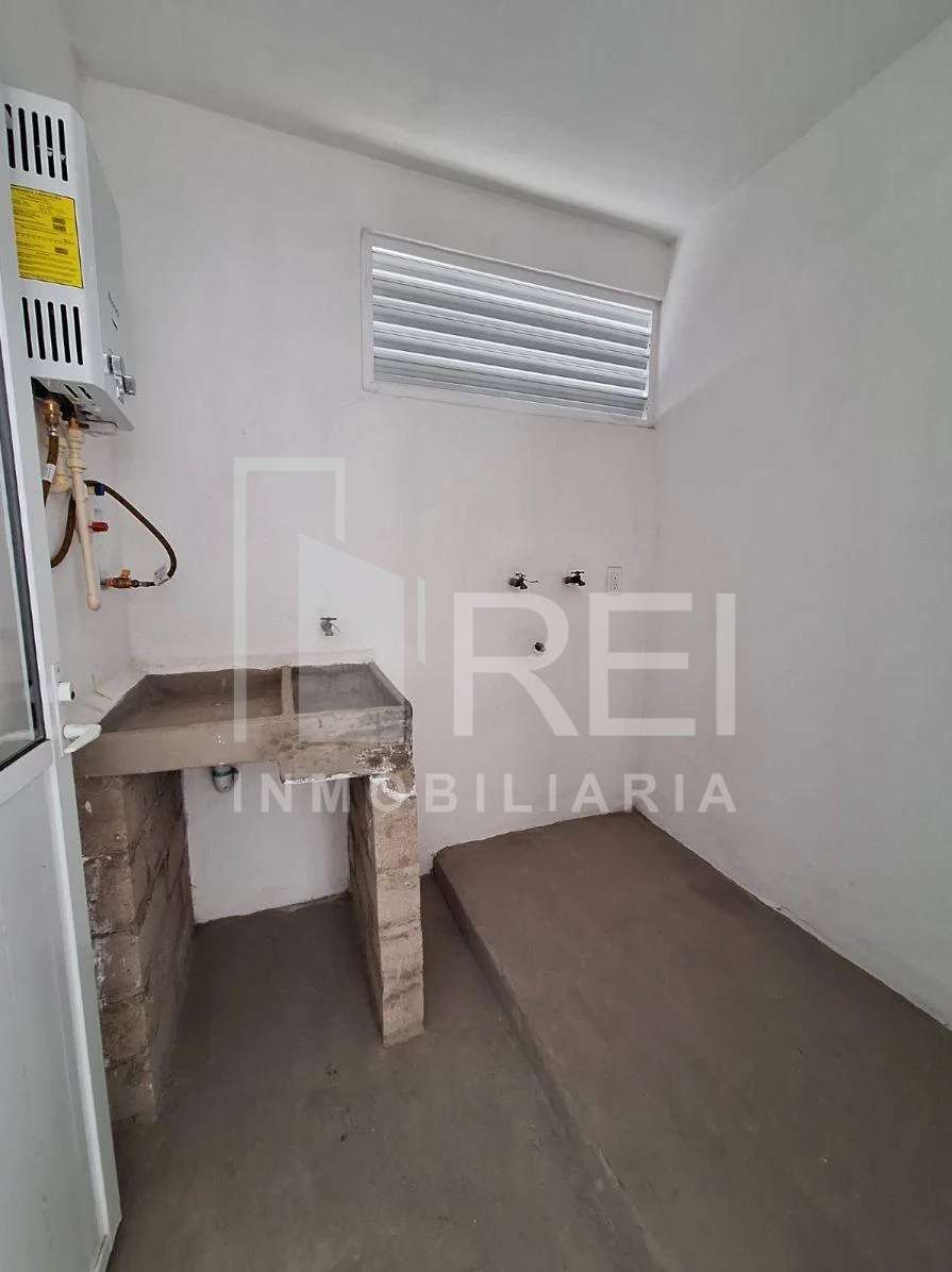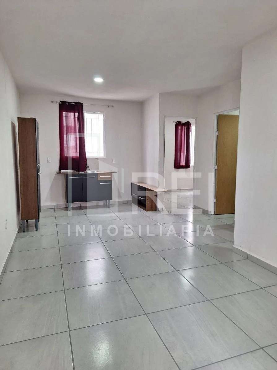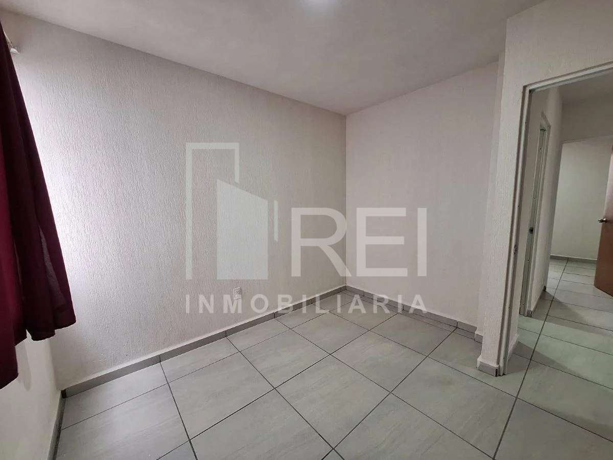 Esta en el primer piso, cuenta con sala, comedor, área de cocina, dos recamaras, baño completo, área de lavado y cochera para un auto. El departamento tiene tanque estacionario, protecciones, algunos muebles de cocina y cortinas.