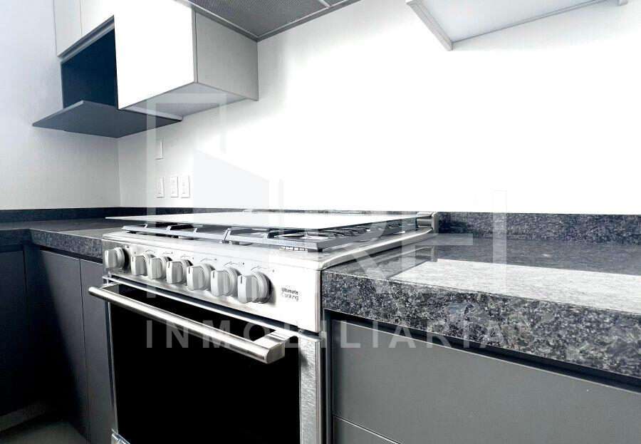 P.B. Sala-comedor, cocina integral, con barra de granito, patio, área de lavado y medio baño.