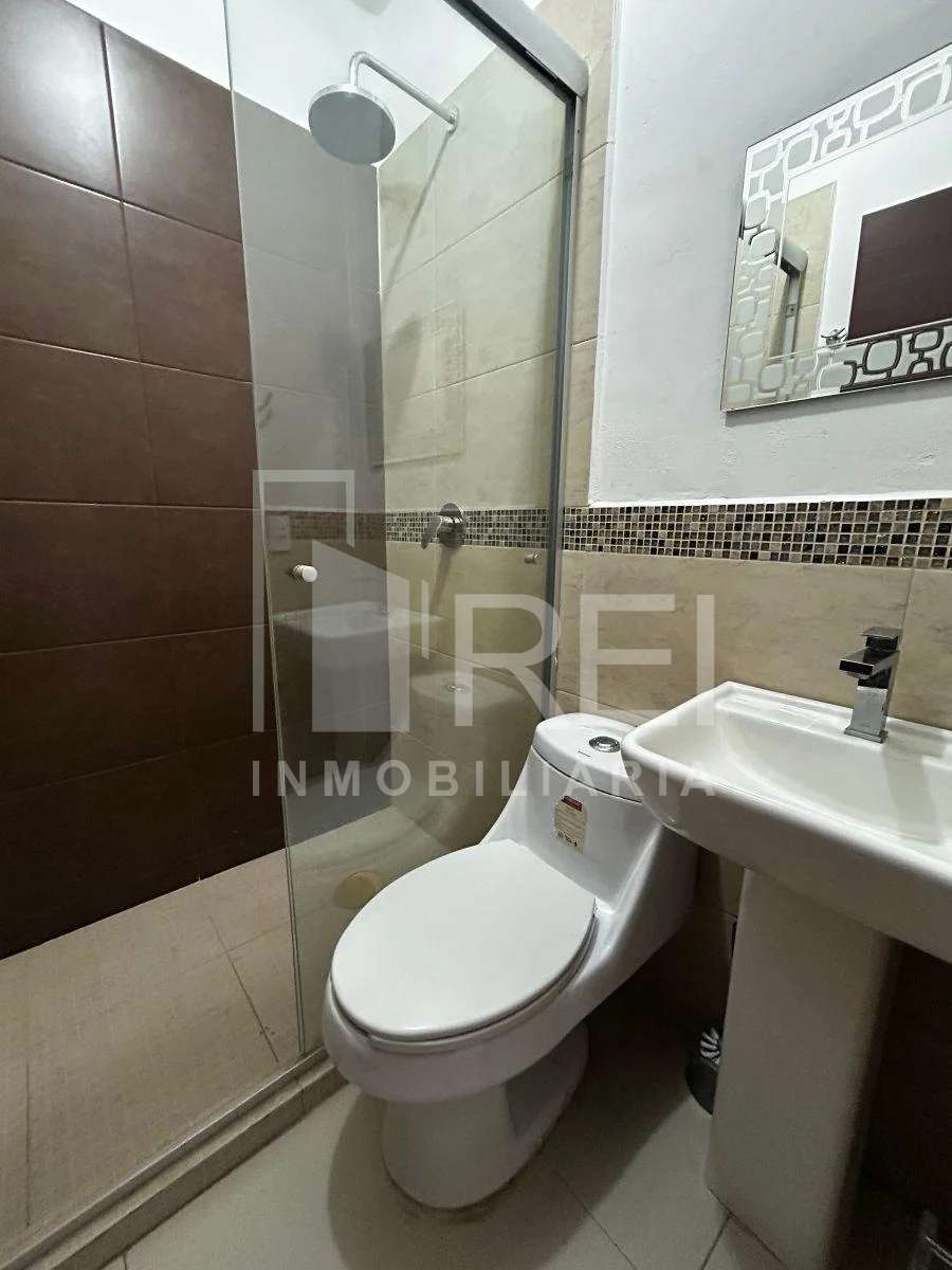 P.B. Estacionamiento para dos autos, sala, comedor, cocina integral, área de lavado techada, una recámara con closet y baño completo.