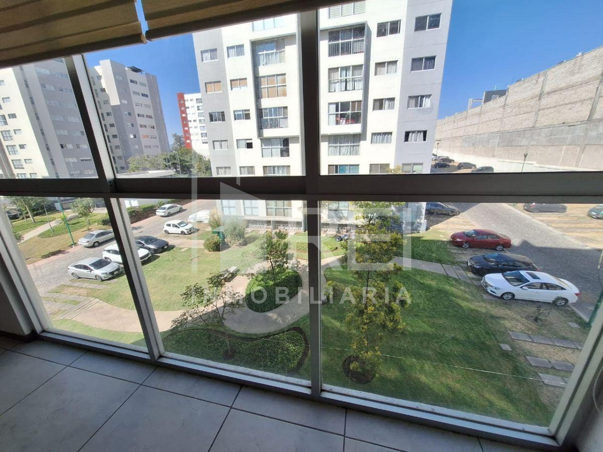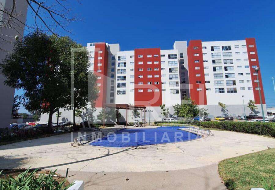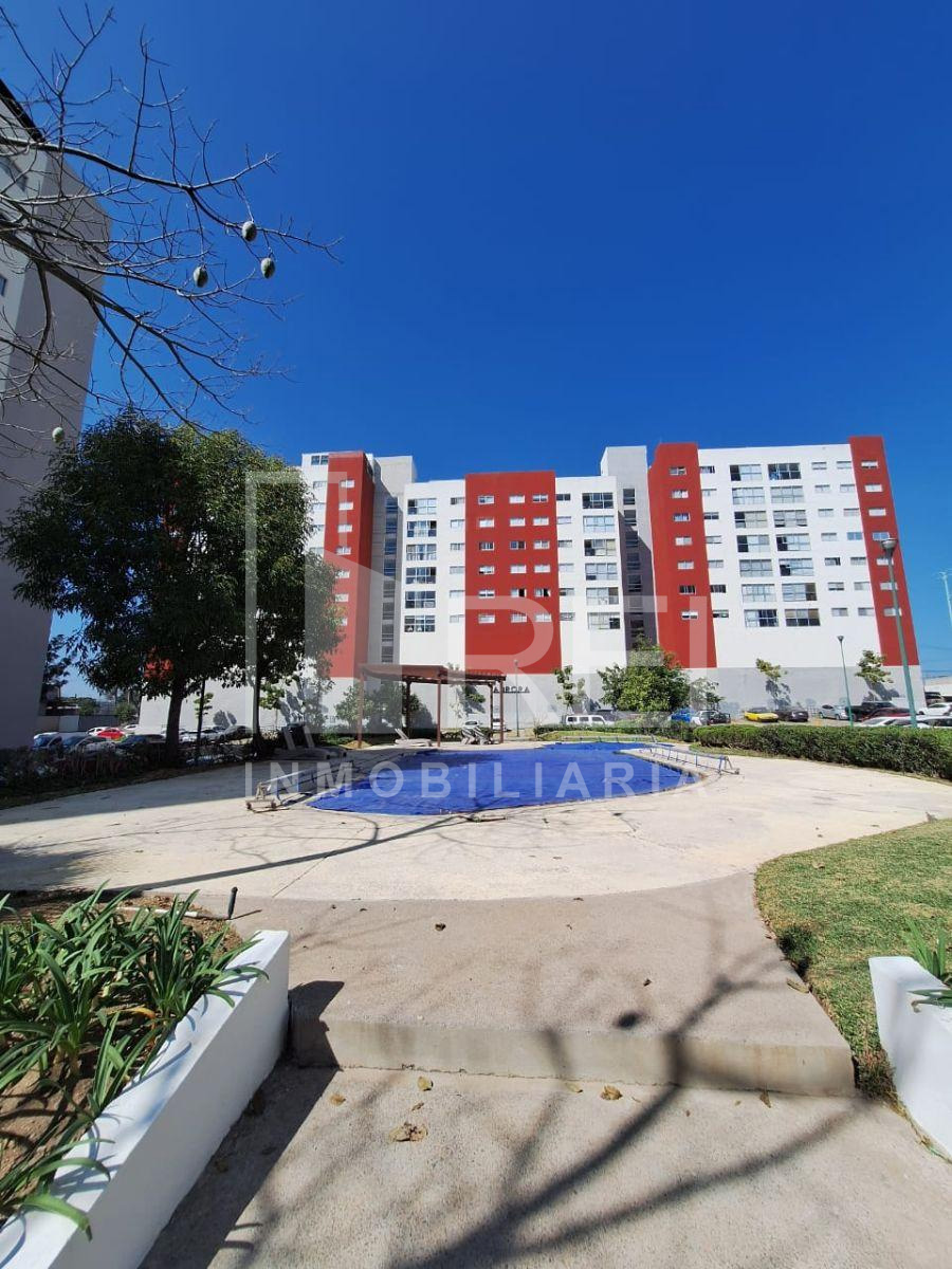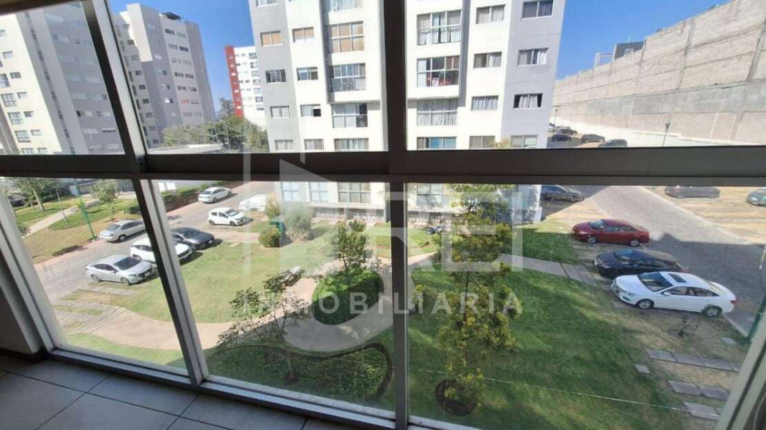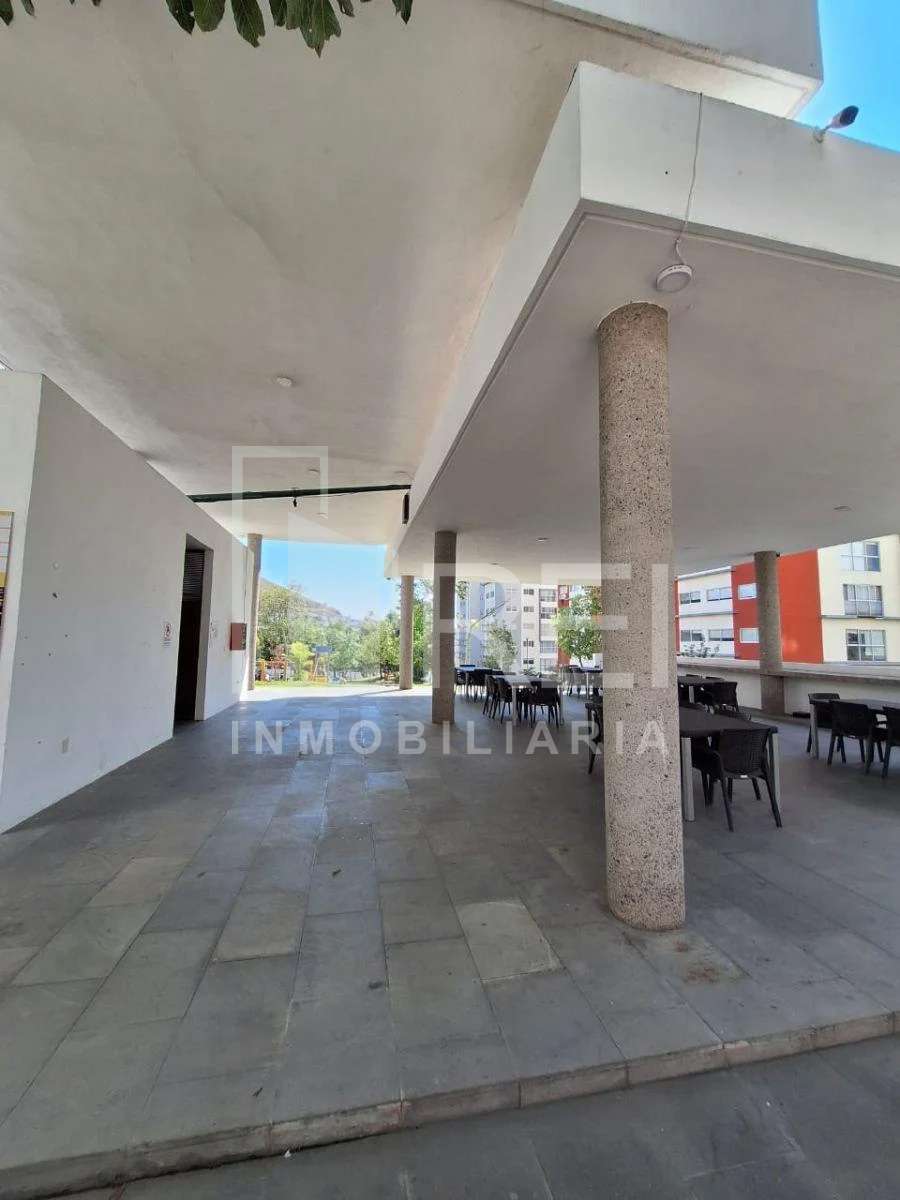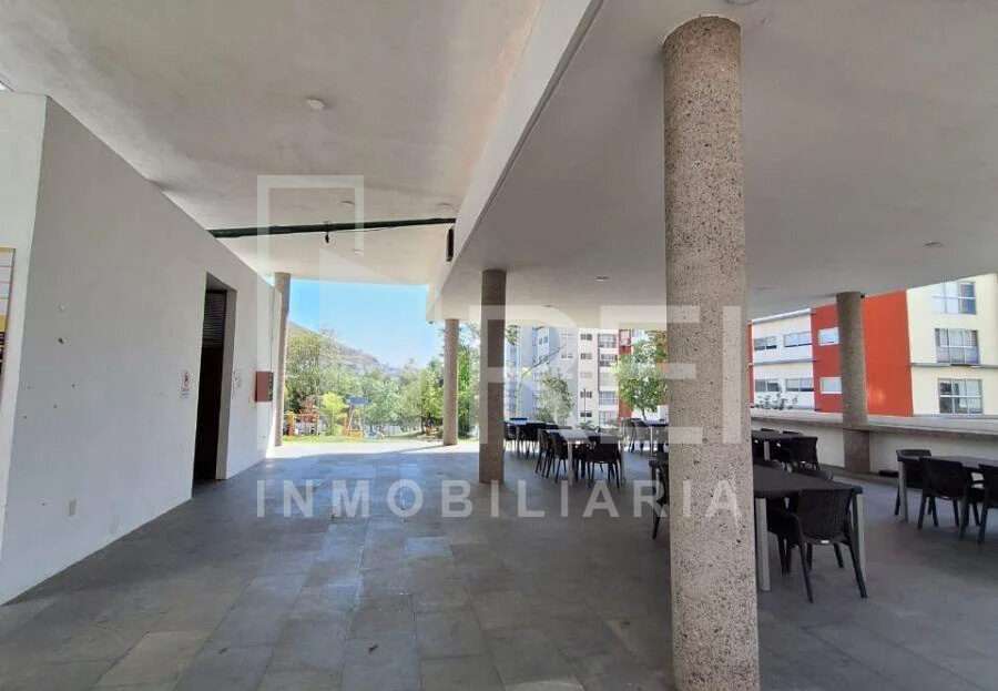 La sala/comedor tiene bonita vista a área verde , acceso controlado, seguridad privada, alberca, terraza, juegos infantiles cerca de la plaza centro sur.