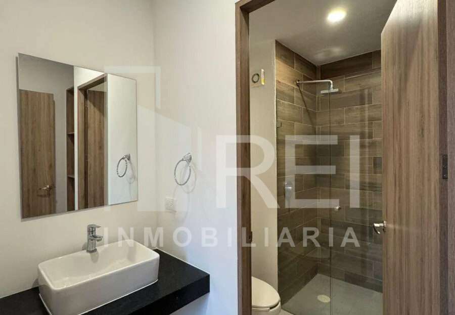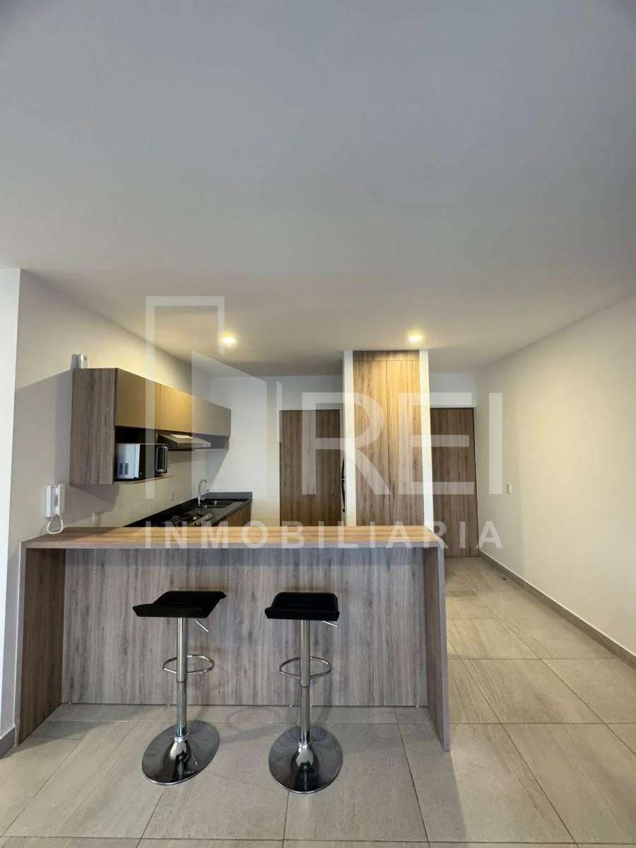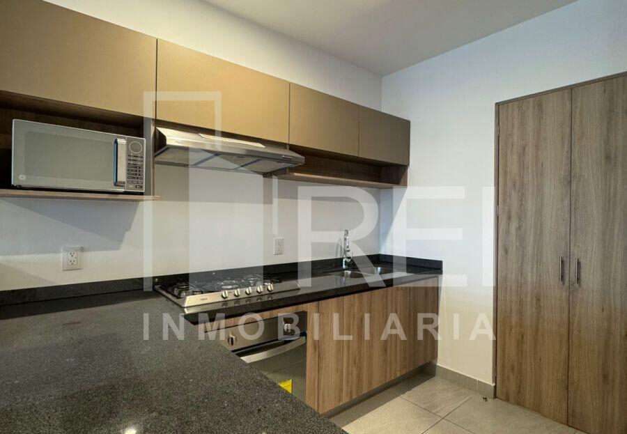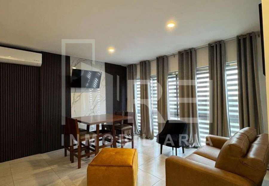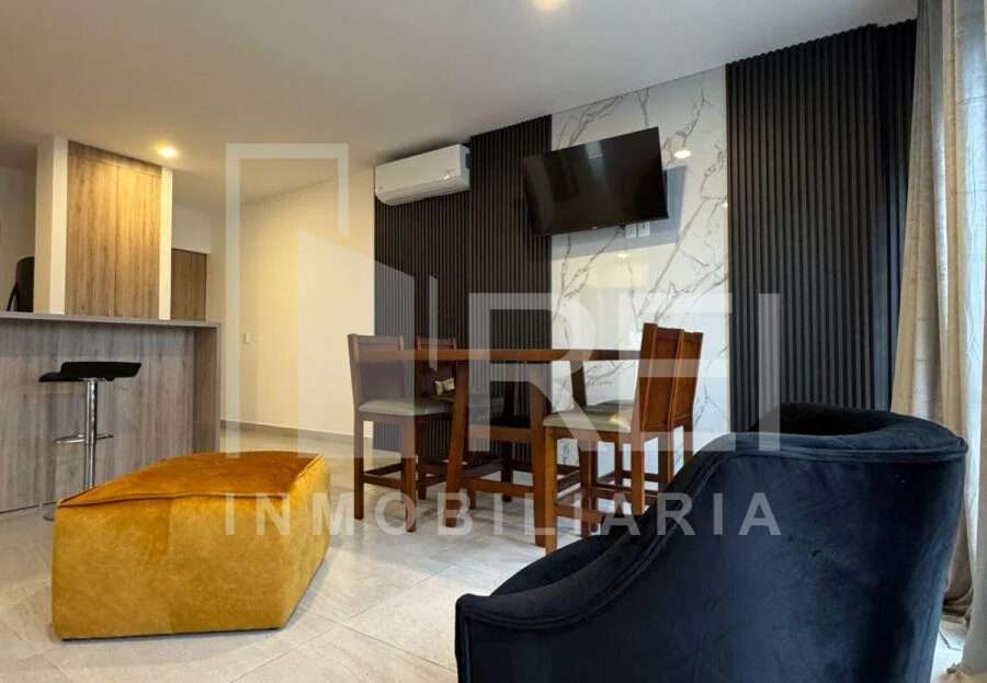Cocina equipada incluye horno, horno microondas y refrigerador. Barra desayunadora con bancos. Sala comedor con acabados de lambrin y placa de mármol decorativo incluye Smart TV de 43″ pulgadas con soporte articulado y minisplit TecInverter Frio/Calor de 2 toneladas. Dos habitaciones la principal con vestidor y baño completo. Los baños tienen espejos silver mirror 80 x 60 cm en ambos baños.