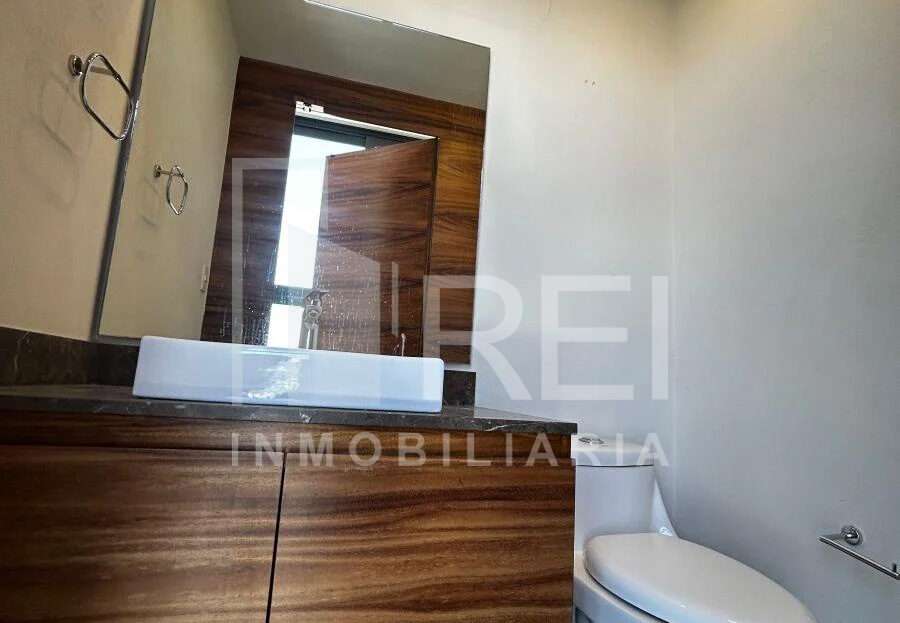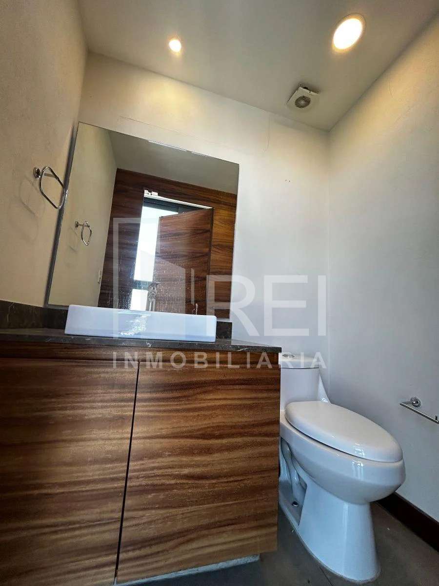 Pasillo con medio baño y área de lavado, recámara principal con closet, aire acondicionado, baño completo y vestidor.