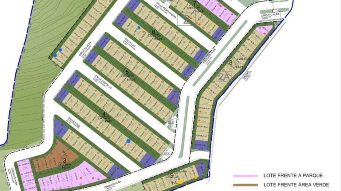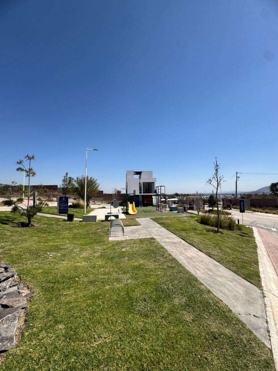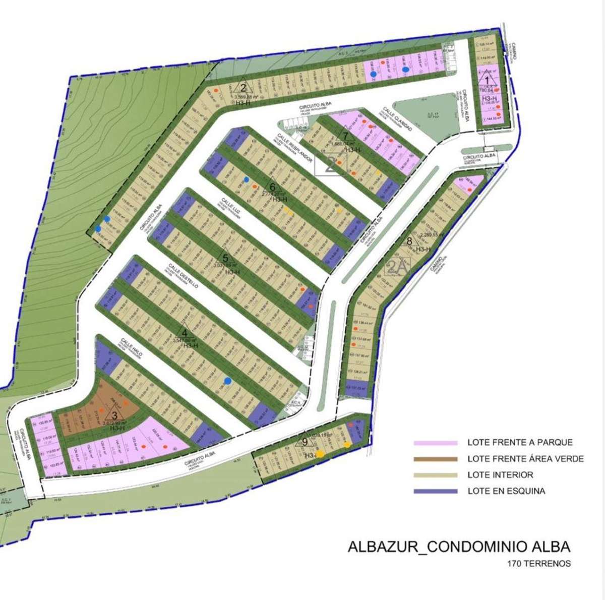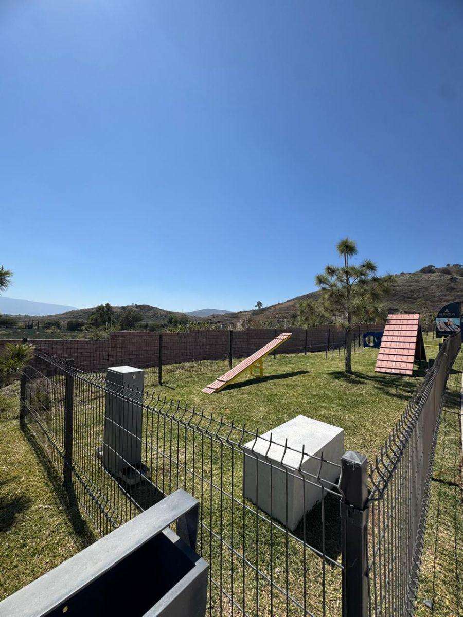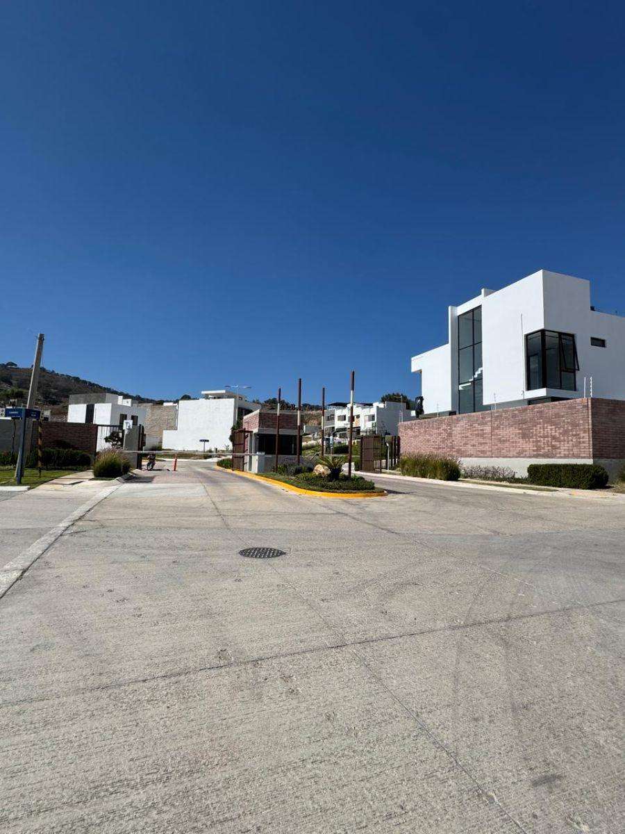 Lote regular cuenta con una superficie de 119m2 (7×17), colinda con muro perimetral y su vista frontal es hacia calle, no tiene vecino enfrente. El lote esta sobre Circuito Alba en la parte más alta del Condominio por lo que tiene una vista muy bonita al cerro.